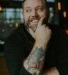 A tall residential building with multiple floors and balconies, set against a clear blue sky. The structure is flanked by lush green trees. At the foreground, a retail space is available for lease, with visible signs advertising it. Several vehicles, including vans and cars, are parked along the street, and a pedestrian walks nearby.